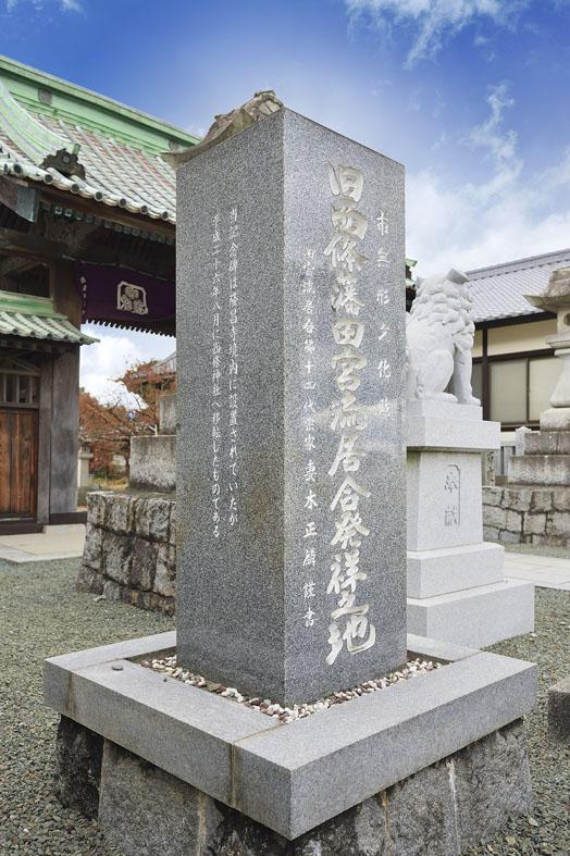 先代の正麟元信宗家の教本の中に「旧西条藩田宮流居合発祥の地」の碑の写真が掲載されていました。この碑は西条神社様の山門脇の境内に有り、