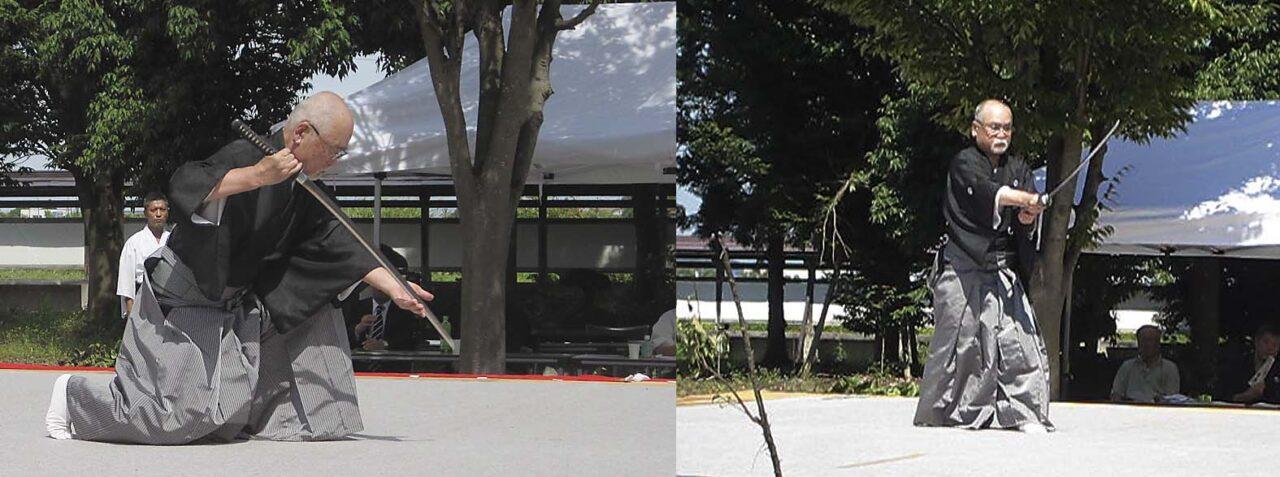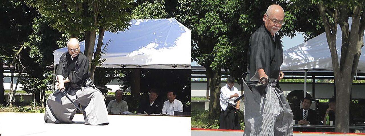 田宮流は、宗家を先頭に壇に上がり、神前の拝礼後先鋒は宗家とTさんが木刀で組太刀打ちを披露する、次鋒にIさんが基本技から5本、中堅はTさんで、四番目に私が座居合を立技に変え「稲妻」「胸の刀」立技「追太刀」奥居合から「刀合切」「水鏡」「松風」「夜嵐」の7本を抜いた。